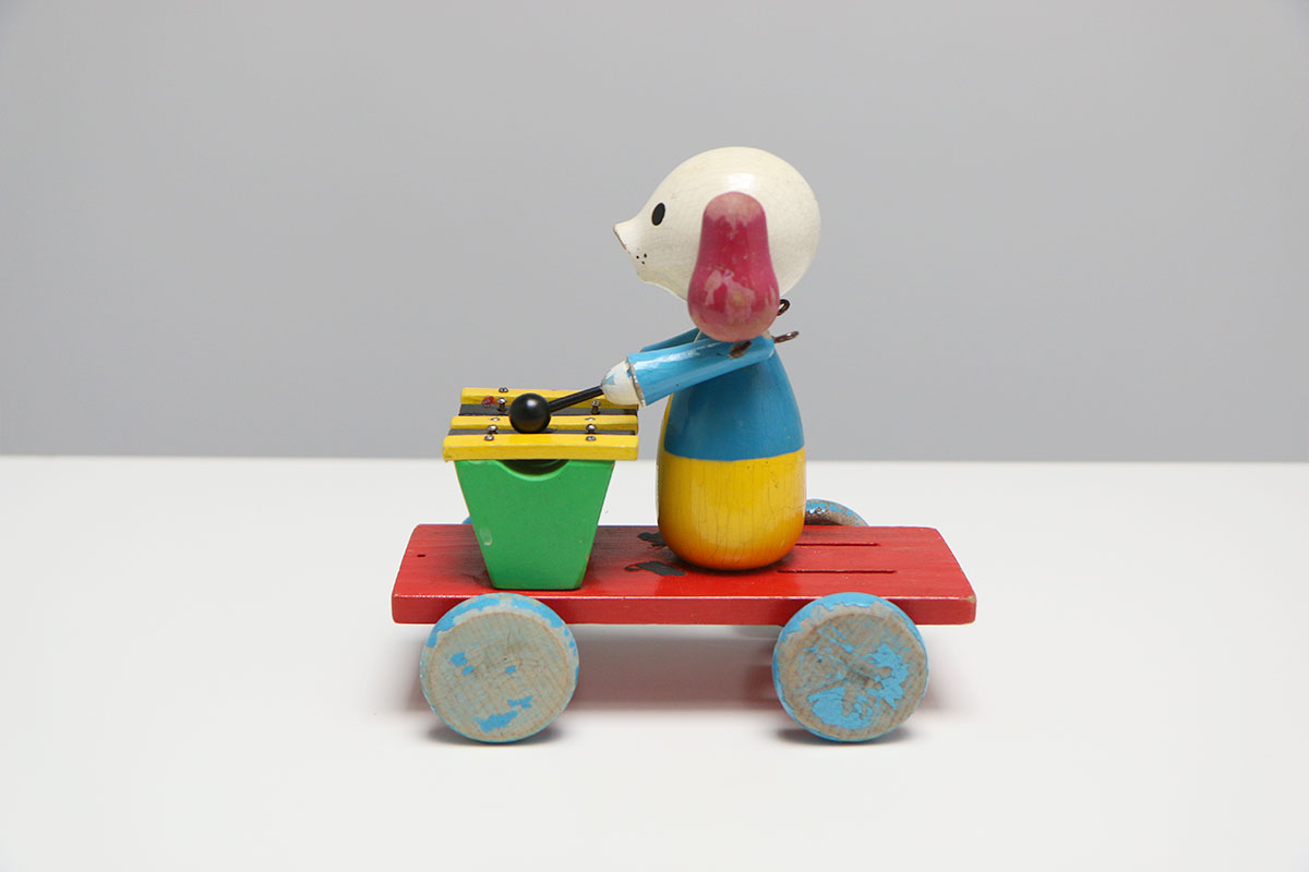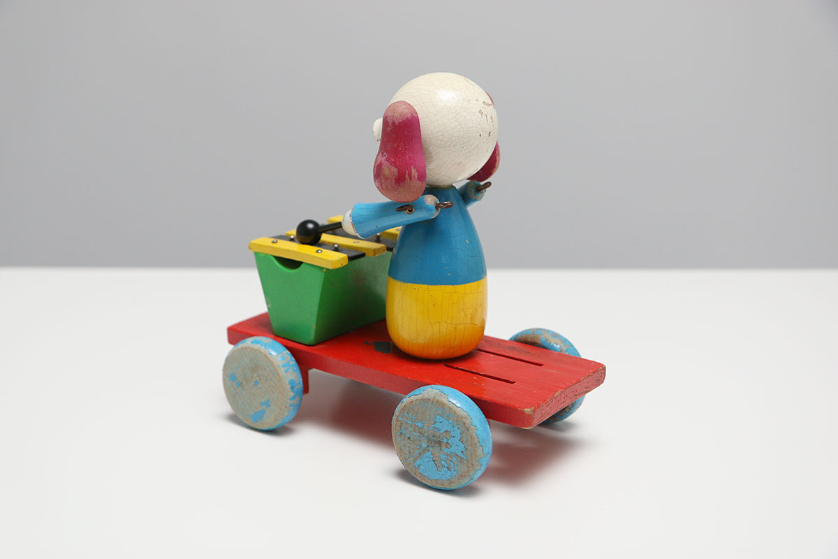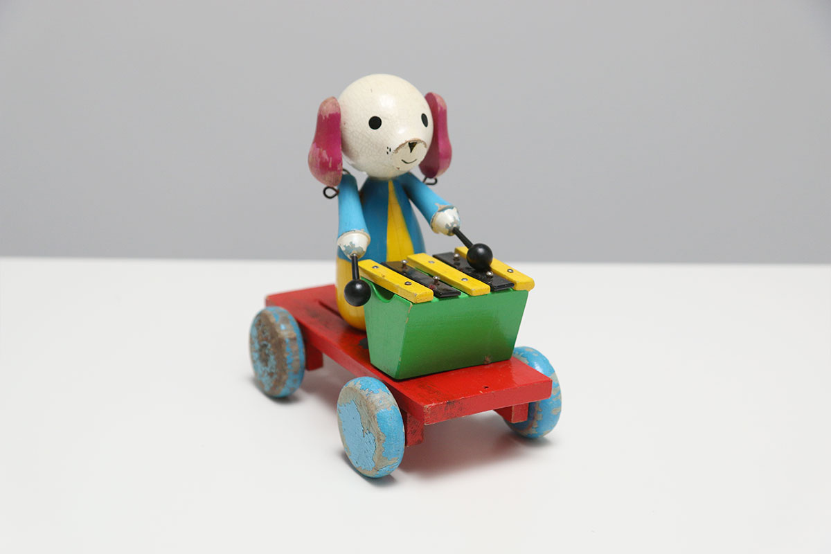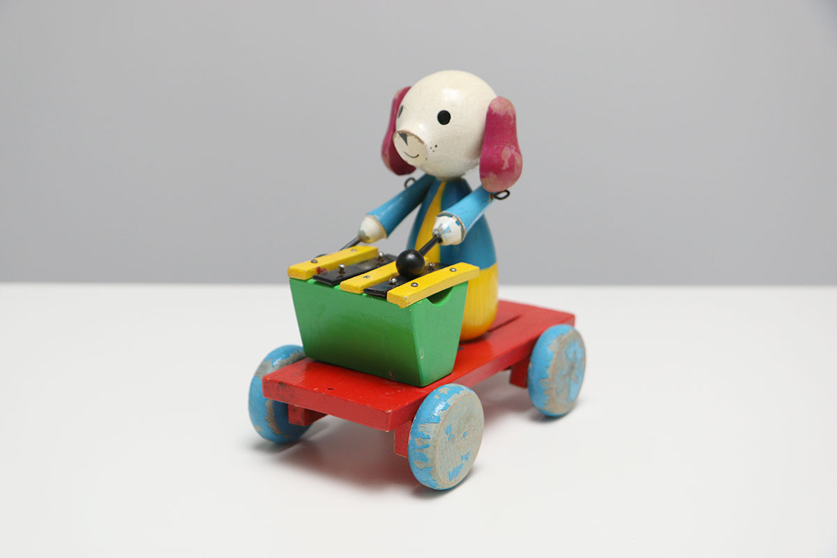 Ben jij ook gek op gebruikte houten speelgoed? Dit hondje zit op een karretje en bespeeld een xylofoon. Het mechanisme is niet helemaal compleet, maar relatief eenvoudig op te lossen. Ideaal voor een handige klusser.