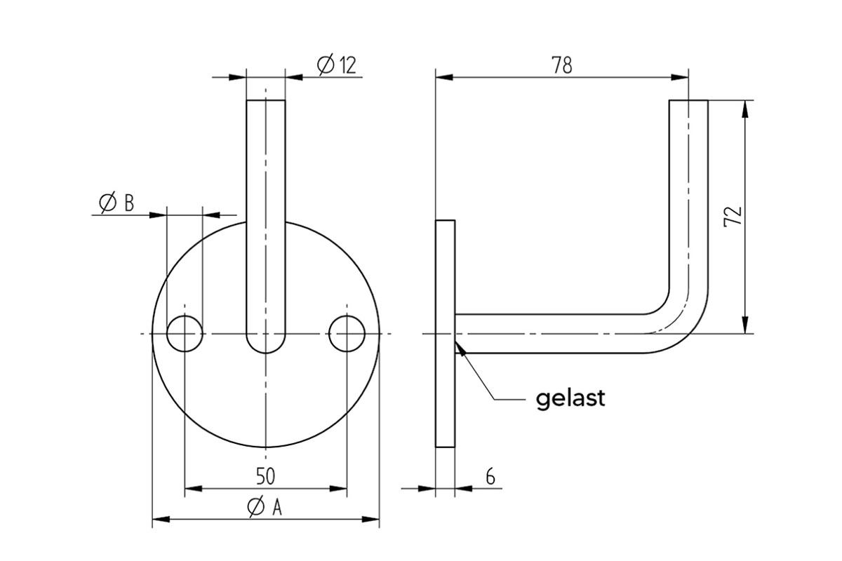 Lasbare trapleuning houder rond van onbehandeld staal. Wanneer jij zelf een trapleuning wilt lassen, is deze leuning houder precies wat je zoekt. De muurschijf is Ø 70mm en de drager rondstaal Ø 11 mm.