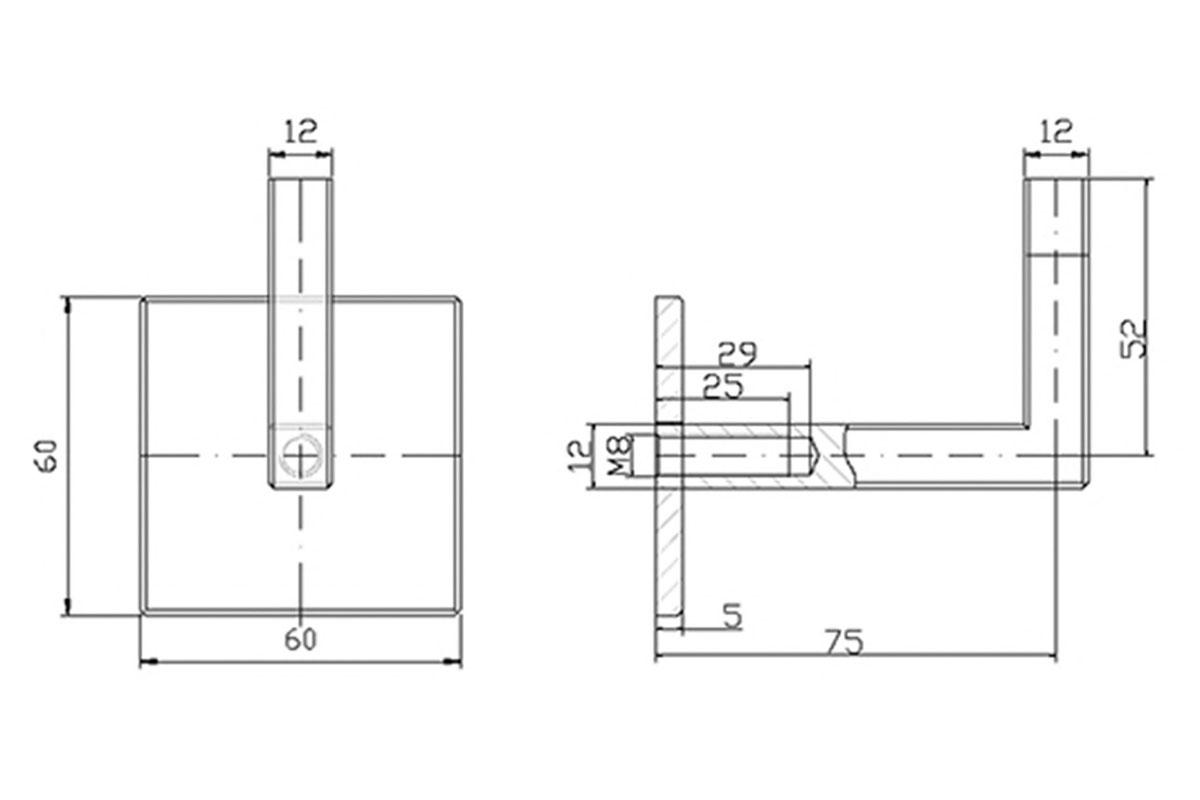 Handige vierkante lasbare trapleuning houder van onbehandeld staal. De leuning houder is voorzien van een binnendraad M8.