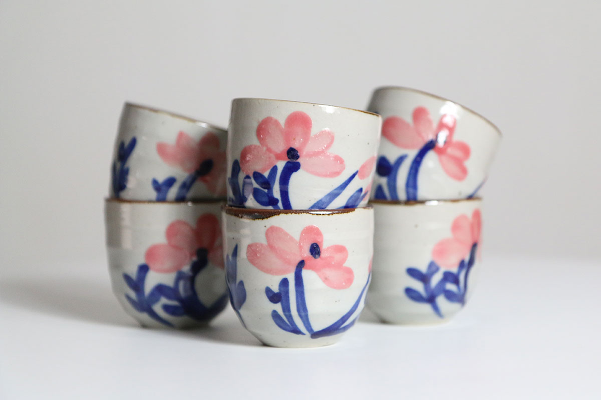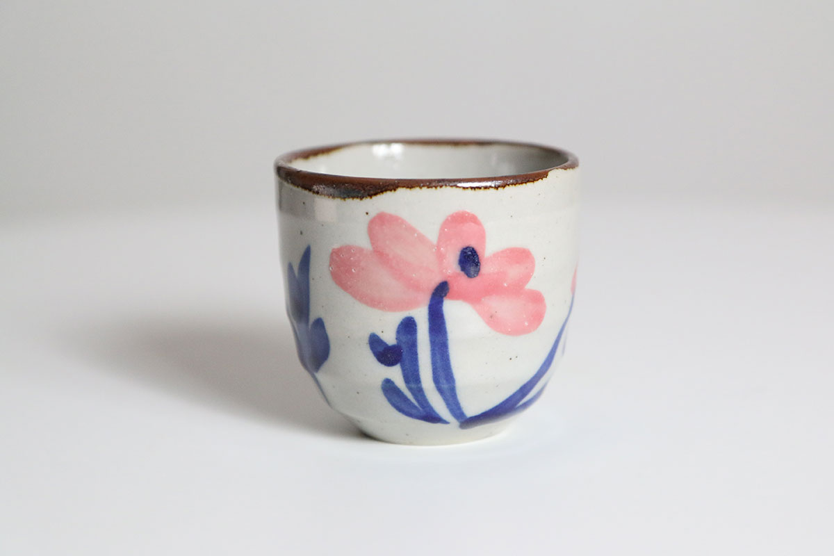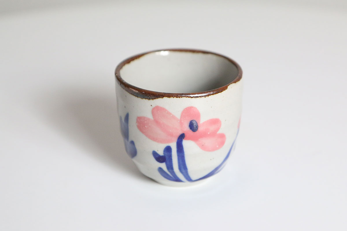 Deze koffiekopjes zijn gemaakt van aardewerk en uitgevoerd in crême met een kleine pikkeltje erin. De bloemen zijn handgeschilderd op de kopjes, in de tekeningen zijn de kleuren roze en blauw gebruikt. Deze koffie kopjes hebben geen oortje om vast te houden. Je kan dus fijn je hele hand om het kopje heen houden.