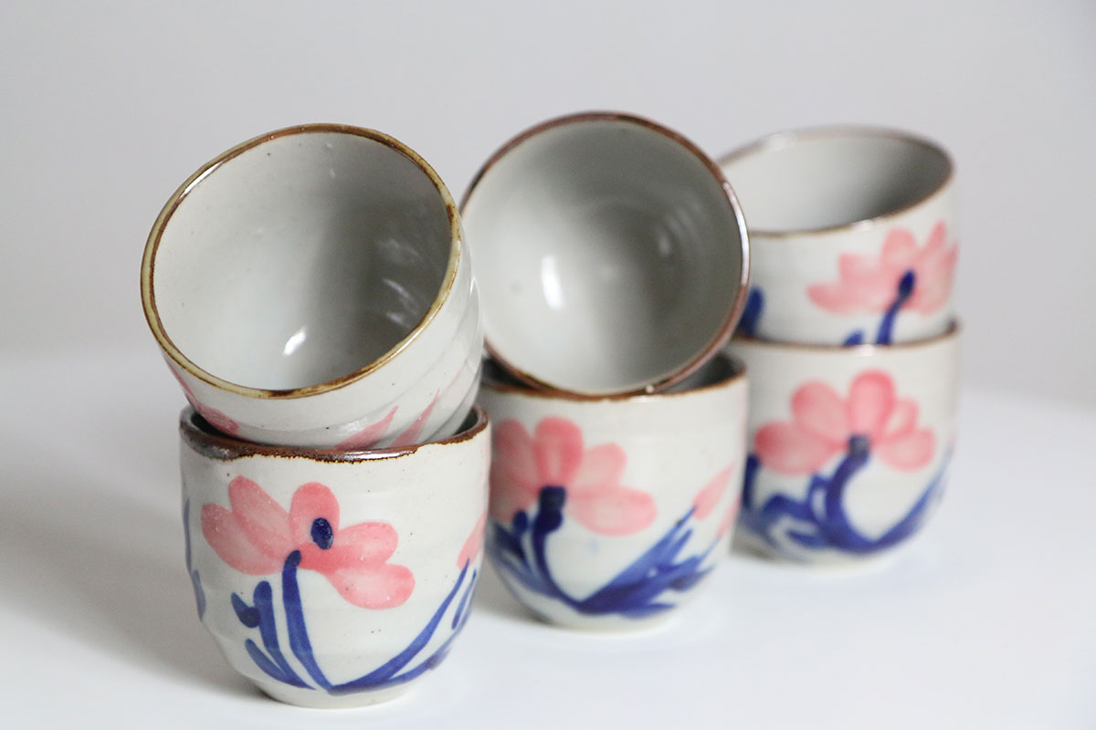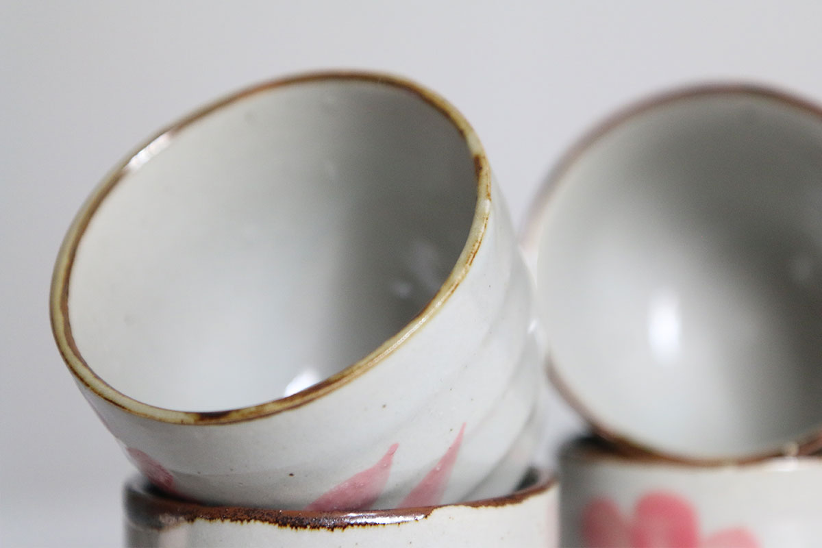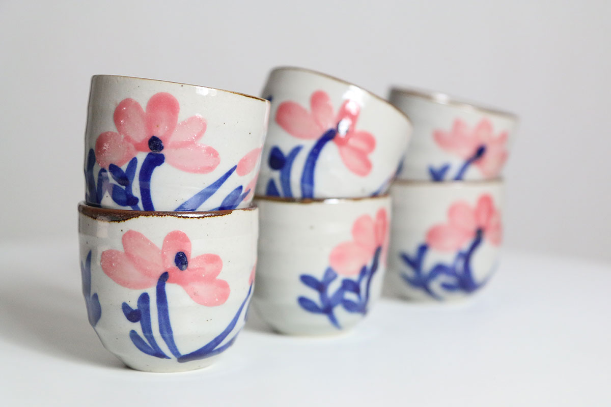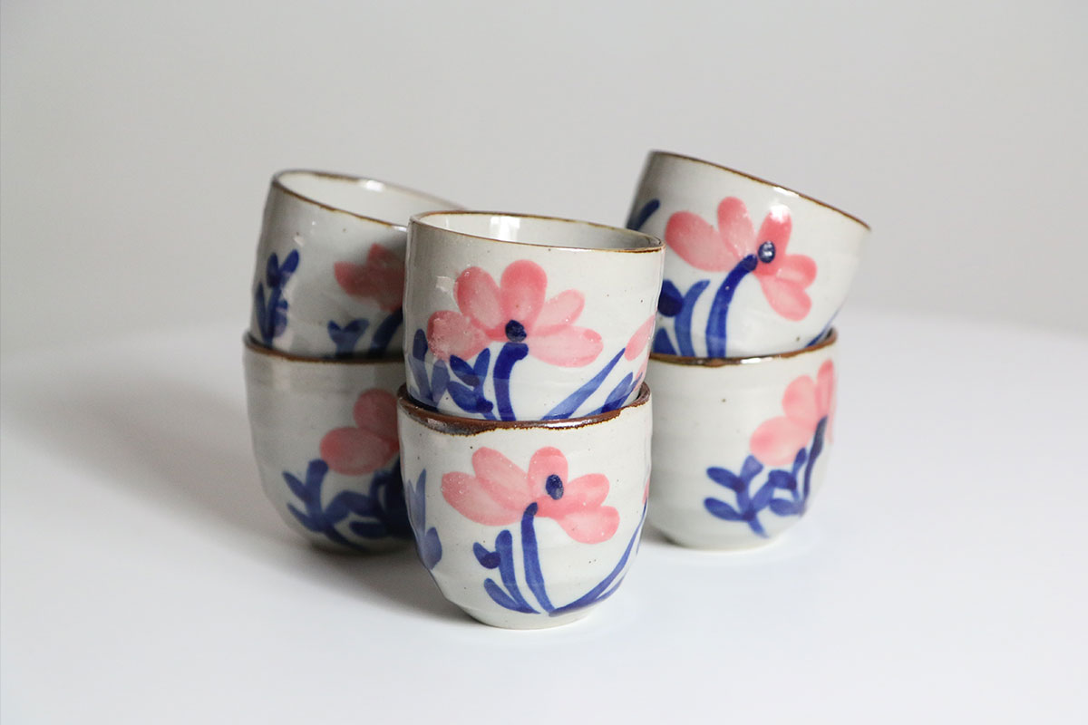 Deze koffiekopjes zijn gemaakt van aardewerk en uitgevoerd in crême met een kleine pikkeltje erin. De bloemen zijn handgeschilderd op de kopjes, in de tekeningen zijn de kleuren roze en blauw gebruikt. Deze koffie kopjes hebben geen oortje om vast te houden. Je kan dus fijn je hele hand om het kopje heen houden.